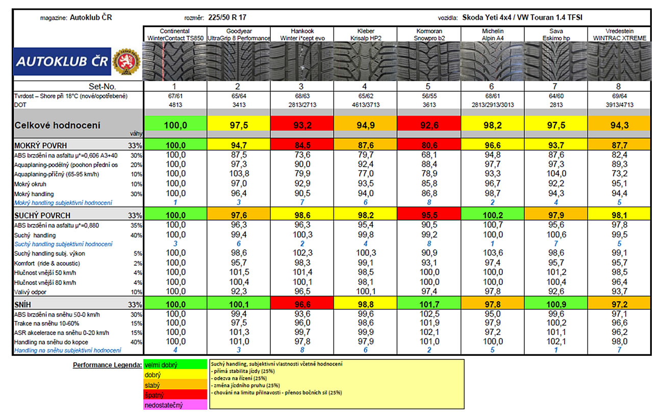 Kvalitné zimné pneumatiky musia podávať dobré výkony vo všetkých meraných kategóriách. Testy vykonané Autoklubom ČR preto ukazujú hranice výkonnosti na suchu, na mokre i na snehu.