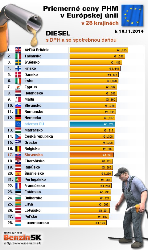 Na Slovensku čerpali motoristi 17. najdrahšiu motorovú naftu s daňou v rámci Európy: 1,291 EUR za 1L.