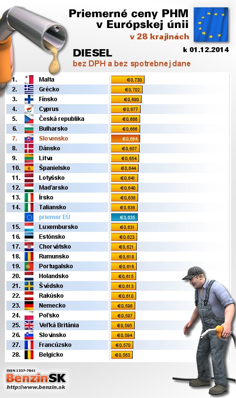 Nasledujúce údaje sú spracované podľa informácií EUROSTATU vydaných 05.12 k 01.12.2014 za obdobie v 48.týždni (od 24.11.2014 - 30.11.2014), ako ich uviedli členské štáty EU. Ceny sú uvádzané v euro. V tabuľke uvádzame štáty Európy podľa toho, za akú priemernú sumu v predchádzajúcich dňoch tankovali.