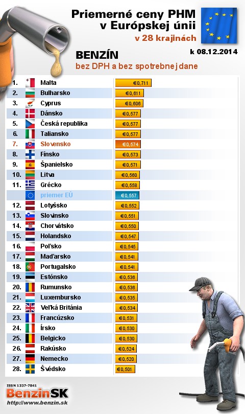 Na Slovensku sme tankovali 22. najlacnejší benzín bez dane v EÚ za priemernú cenu: 0,574 EUR za 1L.