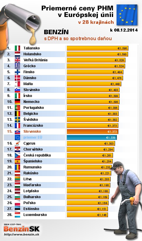 Na Slovensku sme tankovali 15. najdrahší benzín s daňou v EÚ za priemernú cenu: 1,373 EUR za 1L.