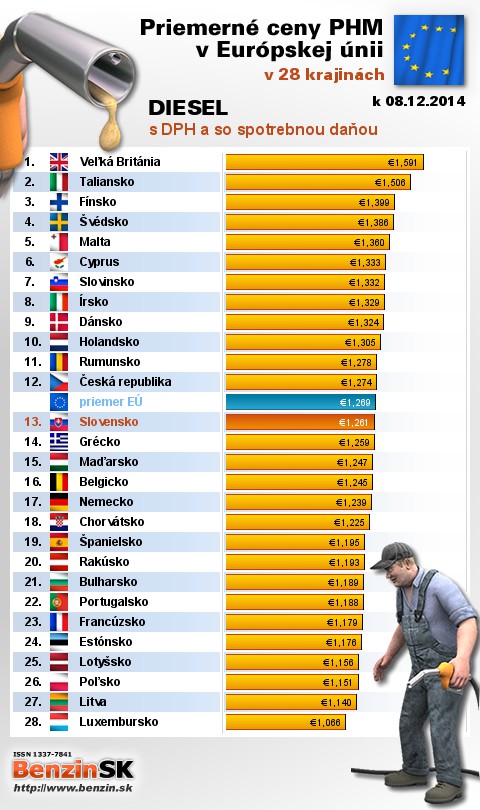 Na Slovensku čerpali motoristi 21. najlacnejšiu motorovú naftu bez dane v rámci Európy: 0,645 EUR za 1L.