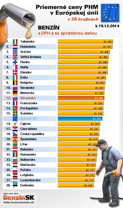 Na Slovensku sme tankovali 12. najdrahší benzín s daňou v EÚ za priemernú cenu: 1,355 EUR za 1L.