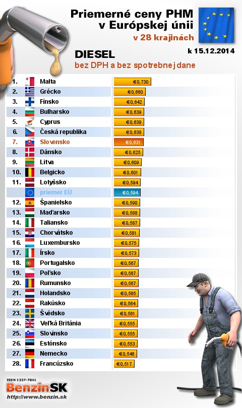 Na Slovensku čerpali motoristi 22. najlacnejšiu motorovú naftu bez dane v rámci Európy: 0,631 EUR za 1L.