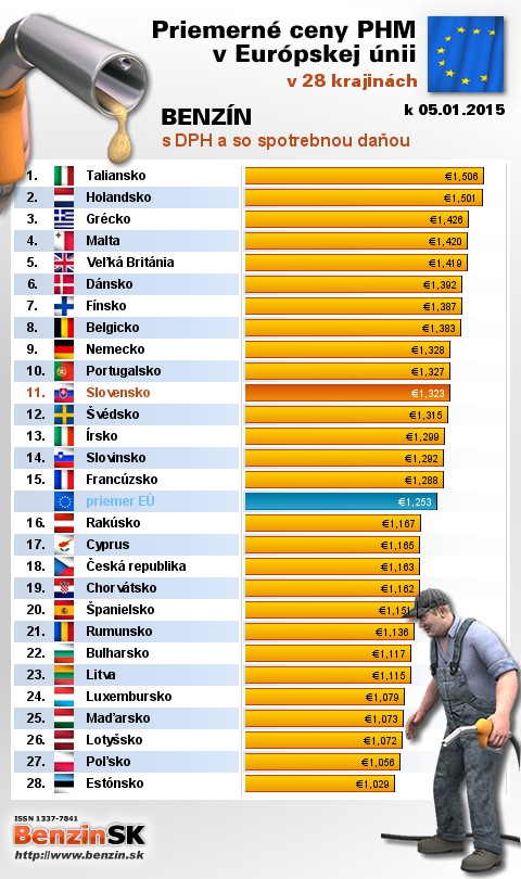 Nasledujúce údaje sú spracované podľa informácií EUROSTATU vydaných 08.01 k 05.01.2015 za obdobie v 1.týždni (od 29.12.2014 - 04.01.2015), ako ich uviedli členské štáty EU. Ceny sú uvádzané v euro. V tabuľke uvádzame štáty Európy podľa toho, za akú priemernú sumu v predchádzajúcich dňoch tankovali.