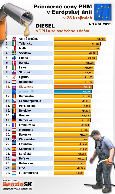 mali vo Veľkej Británii, kde motoristi v priemere zaplatili 1,492 EUR za 1L.