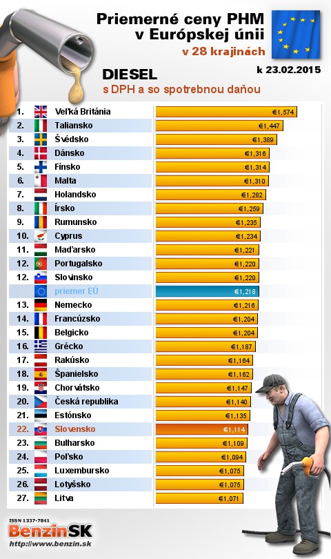Nasledujúce údaje sú spracované podľa informácií EUROSTATU vydaných 26.02 k 23.02.2015 za obdobie v 8.týždni (od 16.02.2015 - 22.02.2015), ako ich uviedli členské štáty EU. Ceny sú uvádzané v euro. V tabuľke uvádzame štáty Európy podľa toho, za akú priemernú sumu v predchádzajúcich dňoch tankovali.