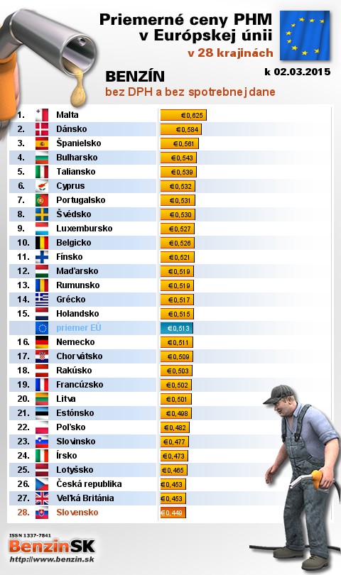 Na Slovensku sme tankovali 1. najlacnejší benzín bez dane v EÚ za priemernú cenu: 0,449 EUR za 1L.