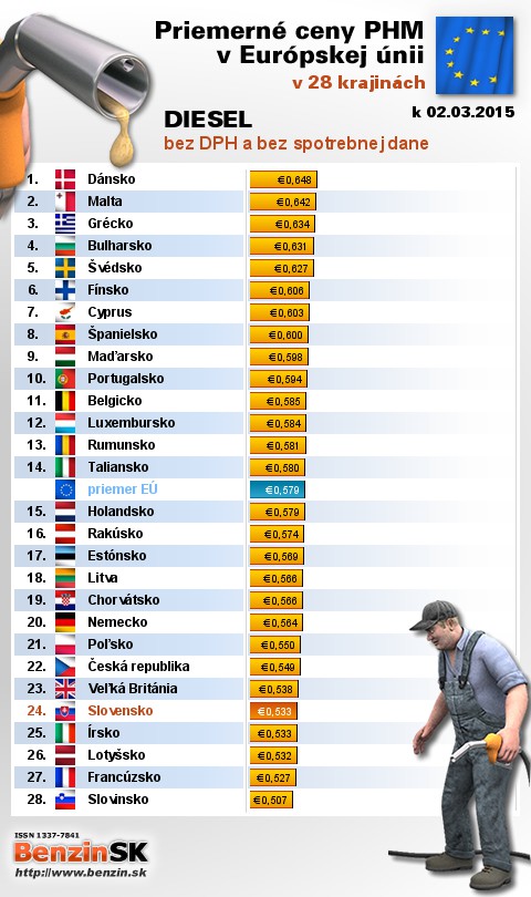 Na Slovensku čerpali motoristi 5. najlacnejšiu motorovú naftu bez dane v rámci Európy: 0,533 EUR za 1L.