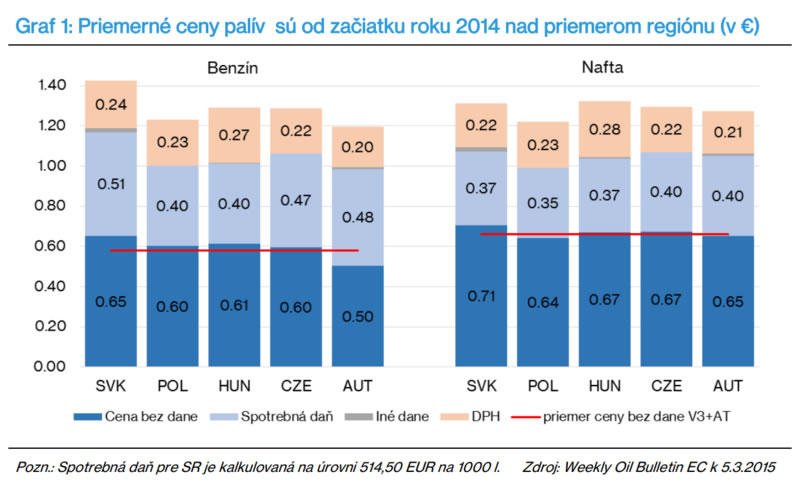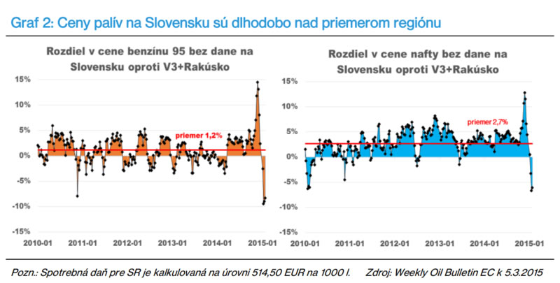 Cena ropy BRENT sa za posledné dva mesiace minulého roka prepadla približne z 80 EUR za barel na takmer polovicu. Bez ohľadu na príčinu pádu ceny ropy, tento šok predstavuje prirodzený experiment s možnosťou skúmať reakciu maloobchodných cien palív v našom regióne. Ceny pohonných hmôt na Slovensku sú v priemere vyššie ako v susedných štátoch regiónu (Graf 1). V prípade benzínov (nie nafty) je jedným z dôvodov aj vyššia spotrebná daň. Aj po očistení o nepriame dane je však napríklad priemerná čistá cena 95- oktánového benzínu (priemer za rok 2014 a 2015) najvyššia spomedzi visegrádskych krajín a Rakúska. V prípade vyššej ceny nafty neobstojí ani argument rozdielov v nepriamych daniach, keďže tie sú u nás v porovnaní s regiónom naopak nižšie. Motoristi tak za posledných 14 mesiacov tankovali benzín v priemere o sedem centov drahší a pri nafte si priplatili päť centov.