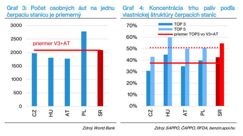 Jedným z dôvodov vyšších cien palív bez dane by mohla byť menej rozvinutá sieť čerpacích staníc, ktorých je na Slovensku v porovnaní s ČR približne trikrát menej. Ak sa však zohľadní aj nižší stupeň motorizácie na Slovensku, tento rozdiel sa stráca (Graf 3). Z pohľadu vlastníckej štruktúry čerpacích staníc je koncentrácia slovenského maloobchodného trhu s pohonnými hmotami v porovnaní s regiónom mierne vyššia, keď traja najväčší hráči obsluhujú vyše 40% trhu (Graf 4). Maďarský trh je však najviac koncentrovaný, ale ako sme ukázali vyššie, ceny palív bez dane sa v Maďarsku i tak významne neodchyľujú od priemeru v regióne.