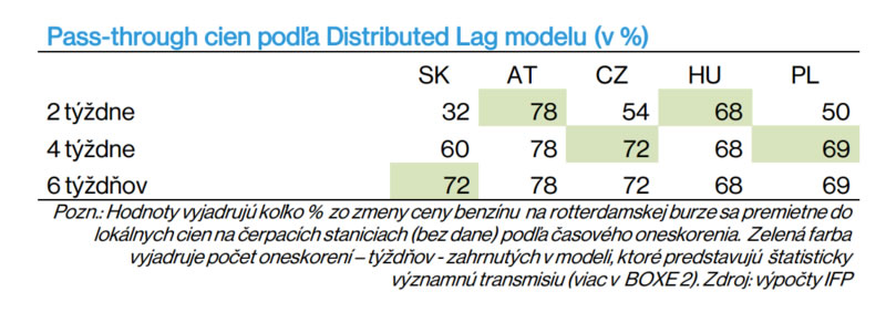 Modelový pohľad potvrdzuje, že prenos burzových cien benzínu do maloobchodných cien na Slovensku je najpomalší v regióne. Pracovali sme s týždennými údajmi cien benzínov 95 očistených o spotrebné dane a DPH vo V4 a v Rakúsku z Weekly Oil Bulletin Európskej komisie. Údaje zahŕňali celé pokrízové obdobie od začiatku roka 2009 až po súčasnosť, čo predstavovalo 285 pozorovaní. Tieto boli následne spárované s týždňovými údajmi cien benzínu High Sulfur kótovaného na rotterdamskej burze a výmenným kurzom EUR/USD. Najjednoduchším ekonometrickým prístupom pre odhad transmisie veľkoobchodných do maloobchodných cien je model s rozloženými oneskoreniami, ktorý zároveň umožňuje identifikovať rýchlosť reakcie maloobchodných cien a jej priebeh v čase. Rôzna elasticita dopytu po palivách, úrovne technológie a maloobchodné marže, ktoré taktiež vplývajú na koncové ceny sú v modeli obsiahnuté súhrnne v nevysvetlenej časti, tzv. rezíduách. Štatisticky významná transmisia cien trvá na Slovensku až šesť týždňov. Naopak, najrýchlejšie čerpacie stanice upravujú ceny v Rakúsku a Maďarsku, kde sa jadro prenosu veľkoobchodných cien do koncových cien pre motoristov realizuje do dvoch týždňov od zmien na burze.
