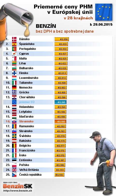 Na Slovensku sme tankovali 10. najlacnejší benzín bez dane v EÚ za priemernú cenu: 0,585 EUR za 1L.