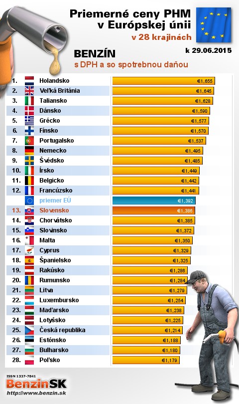 mali v Holandsku, kde motoristi v priemere zaplatili 1,655 EUR za 1L.