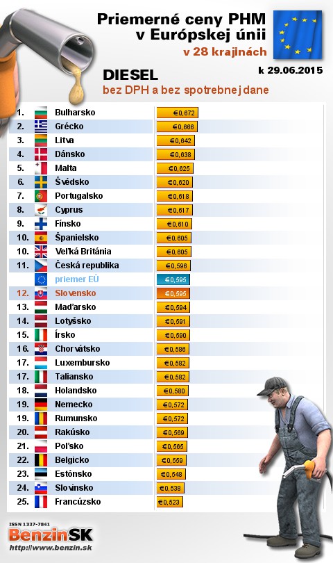 Na Slovensku čerpali motoristi 14. najlacnejšiu motorovú naftu bez dane v rámci Európy: 0,595 EUR za 1L.