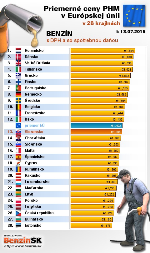 mali v Holandsku, kde motoristi v priemere zaplatili 1,684 EUR za 1L.