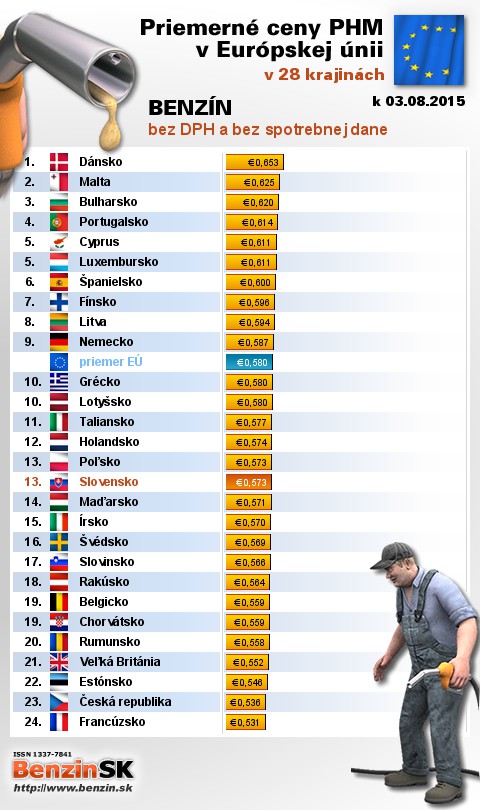 Na Slovensku sme tankovali 13. najlacnejší benzín bez dane v EÚ za priemernú cenu: 0,573 EUR za 1L.
