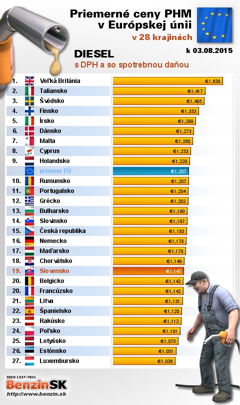 Na Slovensku čerpali motoristi 19. najdrahšiu motorovú naftu s daňou v rámci Európy: 1,147 EUR za 1L.
