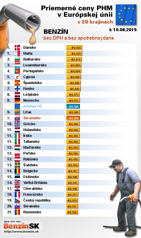 Na Slovensku sme tankovali 9. najlacnejší benzín bez dane v EÚ za priemernú cenu: 0,568 EUR za 1L.