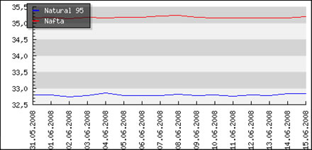| | Nafta: | 1,762 € | | Benzin 95: | 1,697 € | | Benzin 95+: | 1,686 € | | Benzin 99+: | 1,865 € | | LPG: | 0,870 € |
