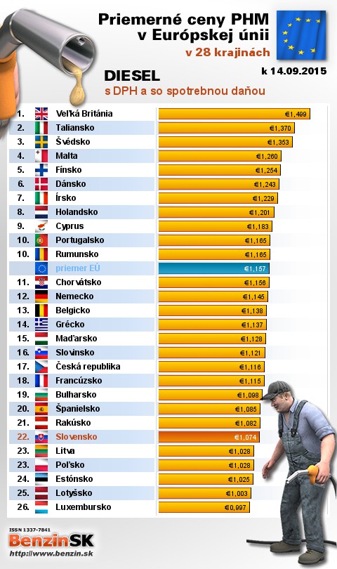 Na Slovensku čerpali motoristi 22. najdrahšiu motorovú naftu s daňou v rámci Európy: 1,074 EUR za 1L.