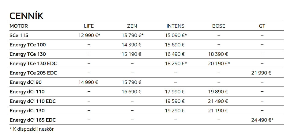 - Energy dCi 110 so šesťstupňovou prevodovkou EDC: 81 kW/110 k a krútiaci moment 250 Nm od 1 750 ot/min. 95 g CO2/km, 3,7 litra/100 km.