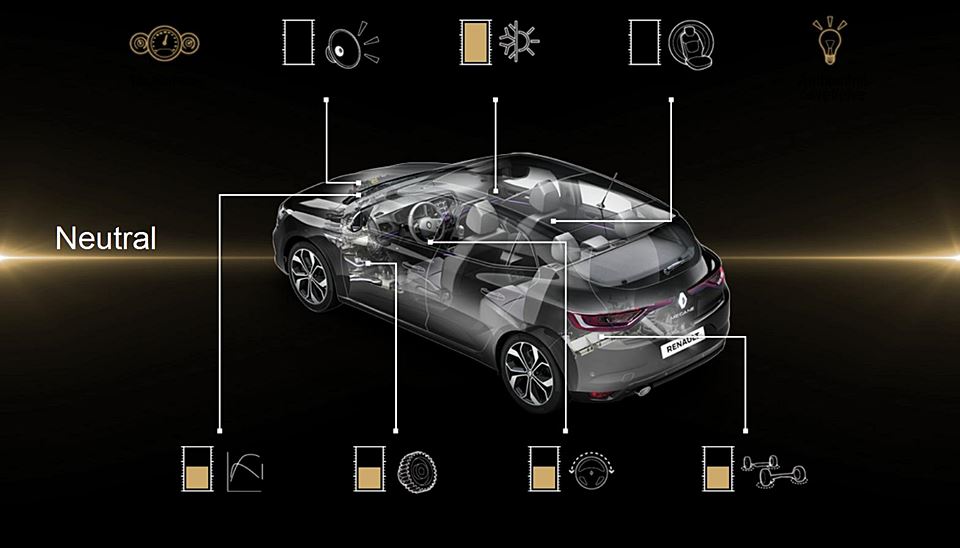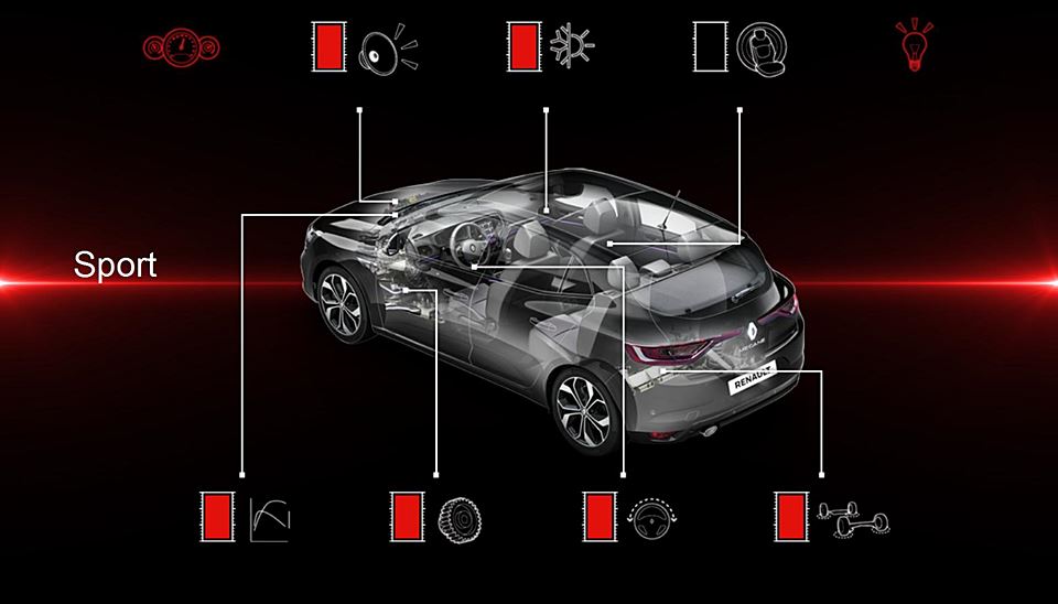 Tlačidlo Multi-Sense na stredovej konzole poskytuje priamy prístup k týmto funkciám na displeji systému R-Link 2 a rovnako aj k piatim jazdným nastaveniam: Neutral, Sport, Comfort, Perso a Eco. Vo verzii GT sa namiesto tlačidla Eco nachádza tlačidlo R.S. Drive, ktoré poskytuje okamžitý prístup k režimu Sport.