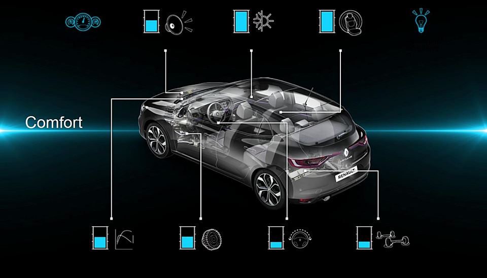 Nový Mégane stojí na modulárnej architektúre CMF C/D (Common Module Family) a prináša celý rad prvkov, ktoré sa obvykle spájajú skôr s vyššími triedami a predstavili sa už v sesterských modeloch Espace a Talisman. Komplexný balík technológií je v tomto segmente jedinečný a okrem iného je jeho súčasťou farebný head-up displej, prístrojová doska s nastaviteľným sedempalcovým displejom Thin Film Transistor (TFT), dva multimediálne tablety systému R-Link 2 (sedempalcový horizontálny alebo 8,7-palcový vertikálny), ako aj technológie Multi-Sense a 4Control.