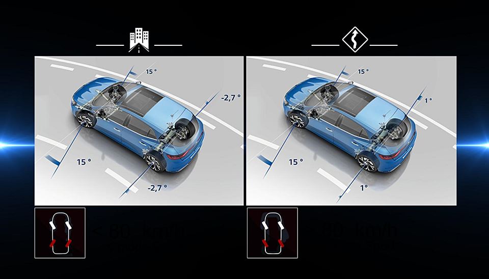 Nový Mégane GT ponúka štyri jazdné nastavenia (Sport, Neutral, Comfort a Perso), ktoré dokážu splniť potreby rôznych vodičov v rôznych momentoch. 4Control pri rýchlostiach pod 80 km/h v režime Sport a pod 60 km/h v ostatných režimoch natáča zadné kolesá do opačného smeru než predné. Vozidlo tak získava precízne a dynamické jazdné vlastnosti charakteristické pre automobil s kratším rázvorom. Nad uvedenými rýchlosťami sa zadné kolesá natáčajú v rovnakom smere ako predné, čo navodzuje pocit vozidla s dlhším rázvorom, typickým pre vyšší segment. Vodič tak v zákrutách získa pocit väčšej bezpečnosti a istoty.