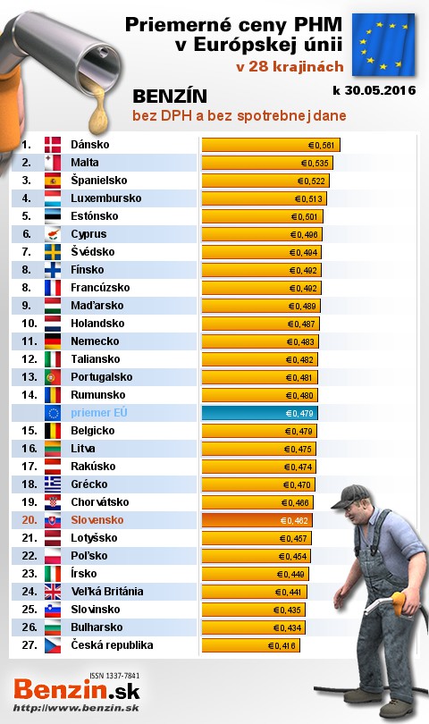 Nasledujúce údaje sú spracované podľa informácií EUROSTATU vydaných 02.06 k 30.05.2016 za obdobie v 21.týždni (od 23.05.2016 - 29.05.2016), ako ich uviedli členské štáty EU. Ceny sú uvádzané v euro. V tabuľke uvádzame štáty Európy podľa toho, za akú priemernú sumu v predchádzajúcich dňoch tankovali.