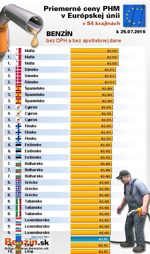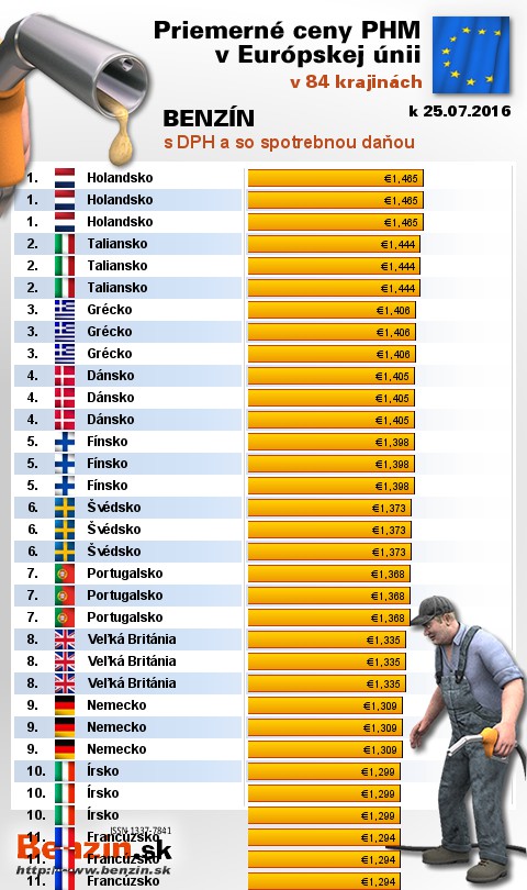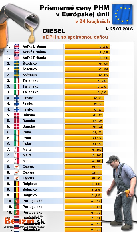 Nasledujúce údaje sú spracované podľa informácií EUROSTATU vydaných 28.07 k 25.07.2016 za obdobie v 29.týždni (od 18.07.2016 - 24.07.2016), ako ich uviedli členské štáty EU. Ceny sú uvádzané v euro. V tabuľke uvádzame štáty Európy podľa toho, za akú priemernú sumu v predchádzajúcich dňoch tankovali.