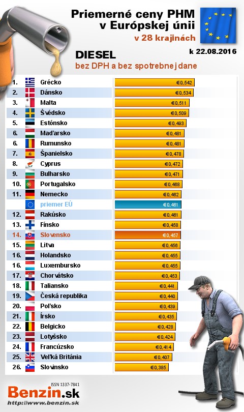 Na Slovensku čerpali motoristi 13. najlacnejšiu motorovú naftu bez dane v rámci Európy: 0,457 EUR za 1L.