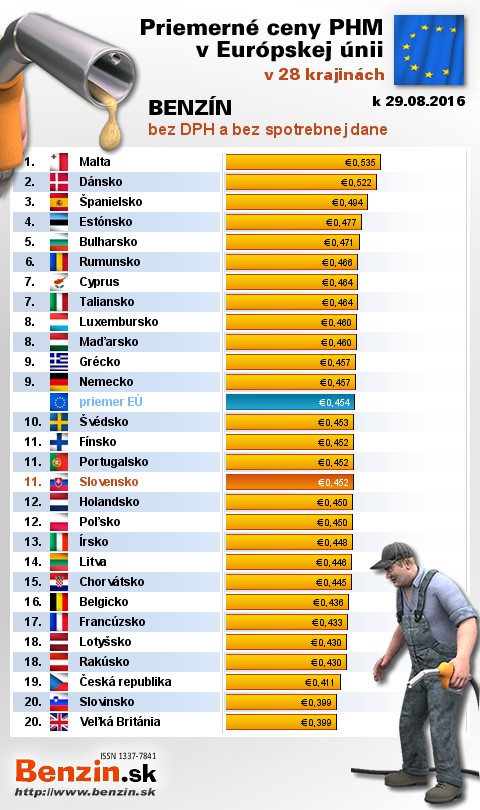 Na Slovensku sme tankovali . najlacnejší benzín bez dane v EÚ za priemernú cenu: 0,452 EUR za 1L.