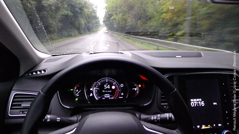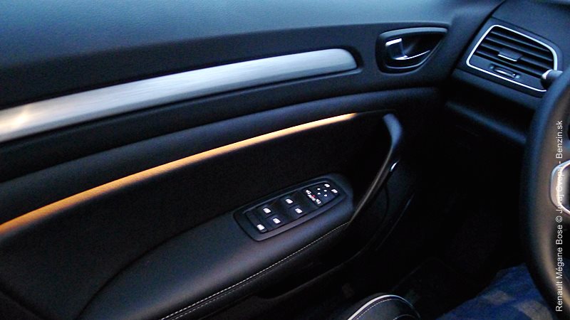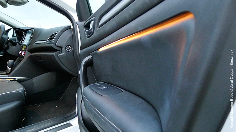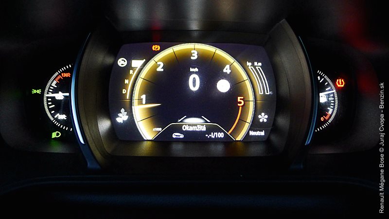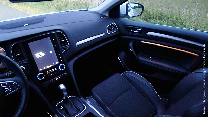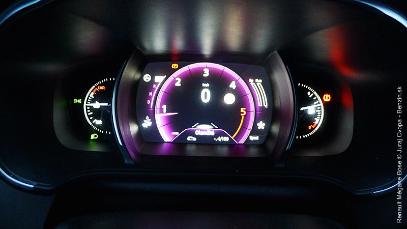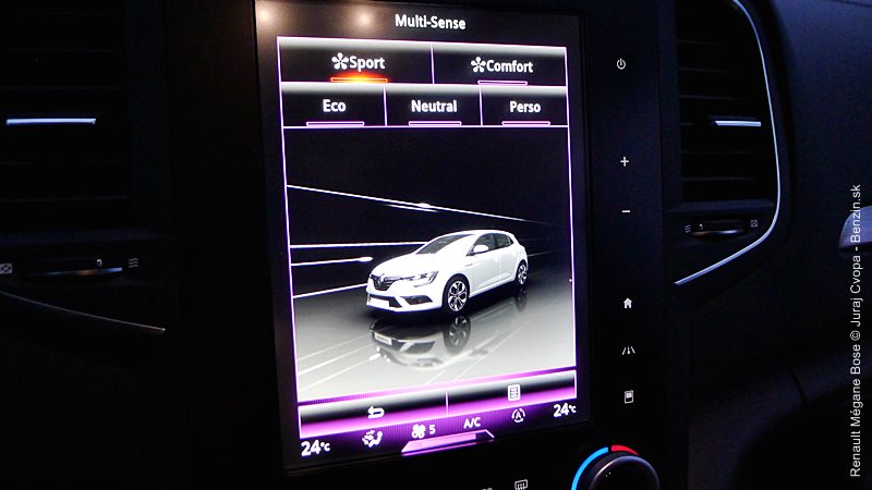 Jednu z hlavných funkcionalít nového prístupu Renaultu tvorí spomenutý program Multi-Sense. Ide o sústavu piatich pamätí/módov s rôznymi prednastaveniami auta. Ide o nastavenie odozvy na stlačenie plynového pedála, rýchlosti zmeny prevodového stupňa v robotizovanej dvojspojkovej prevodovke EDC, odporu volantu, náladového podsvietenia kabíny ale aj masážnej funkcie sedadla vodiča. K týmto pamätiam je priamy prístup cez softvérové tlačidlo a jednotlivé pamäte dostali aj názvy: Neutral, Sport, Comfort, Perso a Eco. V móde Sport má Mégane najrýchlejšie reakcie motora aj automatickej prevodovky a osobne sa mi s ňou jazdilo najprirodzenejšie. Režim Eco optimalizuje režimy motora, prevodovky, ale aj kúrenia a klimatizácie v kabíne pre čo najmenšiu spotrebu a drží motor pri nízkych otáčkach. Ku každej z volieb sa viaže aj samostatná farba osvetlenia kabíny, menovite okrová, červená, modrá, purpurová a zelená. Mení sa osvetlenie stredovej konzoly a v testovanej výbave (a vyššej) aj osvetlenie všetkých dverí a dizajn prístrojovej dosky pred vodičom. Viac vidno na obrázkoch v galérii. Dokonca sa dá nastavovať aj zvuk motora, čo som radšej neskúšal, nie sme doma za počítačom ale v reálnom aute.