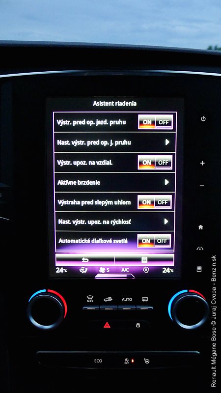 • varovanie pred opustením jazdného pruhu - pri dotyku s čiarou na ceste sa rozvrní reproduktor na príslušnej strane auta, užitočná vec, keď je človek zabratý do všakovakých nastavení cntrálneho displeja