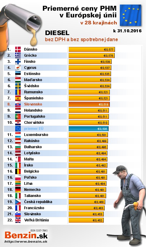 Na Slovensku čerpali motoristi 15. najlacnejšiu motorovú naftu bez dane v rámci Európy: 0,519 EUR za 1L.