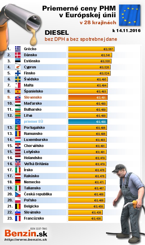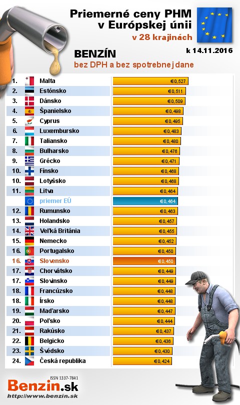 Nasledujúce údaje sú spracované podµa informácií EUROSTATU vydaných 17.11 k 14.11.2016 za obdobie v 45.týľdni (od 07.11.2016 - 13.11.2016), ako ich uviedli členské ątáty EU. Ceny sú uvádzané v euro. V tabuµke uvádzame ątáty Európy podµa toho, za akú priemernú sumu v predchádzajúcich dňoch tankovali.