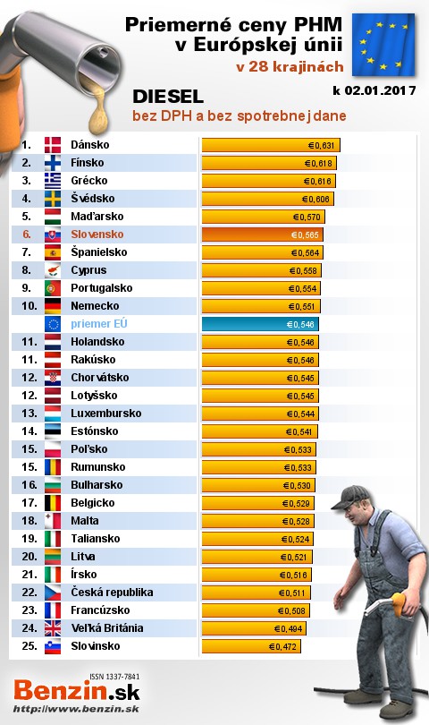 Na Slovensku čerpali motoristi 20. najlacnejšiu motorovú naftu bez dane v rámci Európy: 0,565 EUR za 1L.