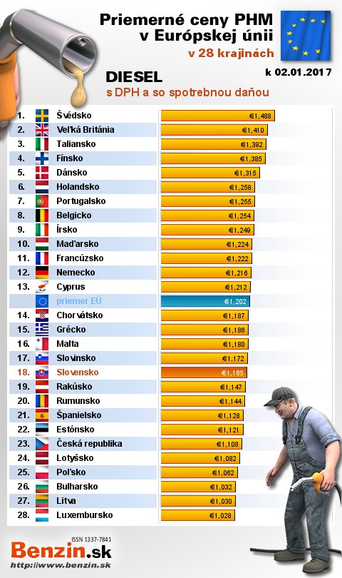 Na Slovensku čerpali motoristi 18. najdrahšiu motorovú naftu s daňou v rámci Európy: 1,165 EUR za 1L.