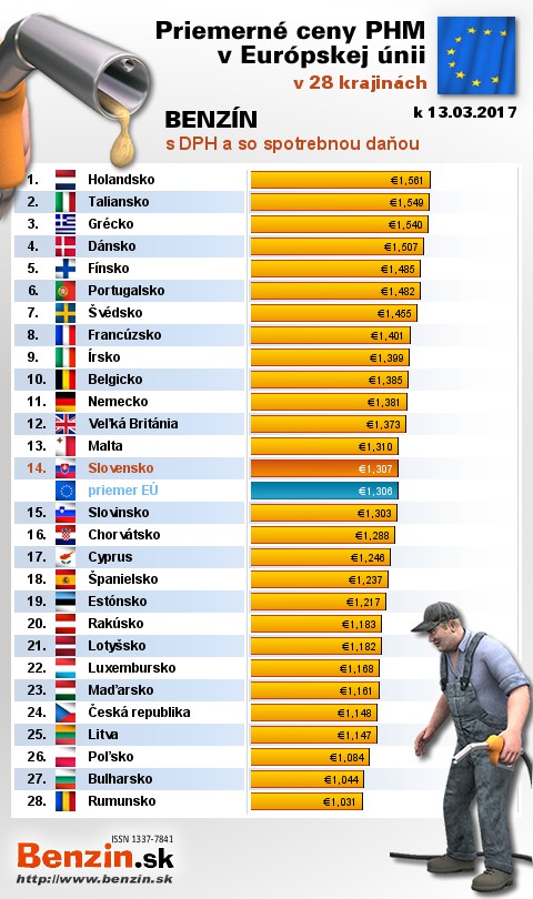 mali v Holandsku, kde motoristi v priemere zaplatili 1,561 EUR za 1L.