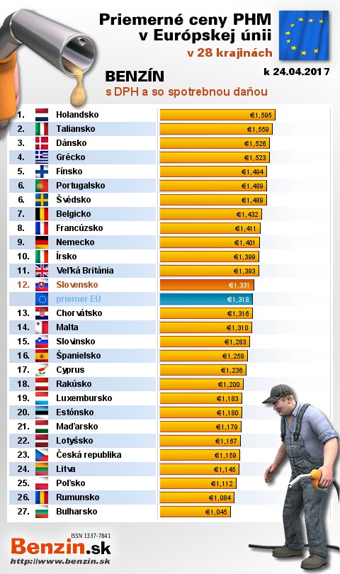 Nasledujúce údaje sú spracované podľa informácií EUROSTATU vydaných 27.04 k 24.04.2017 za obdobie v 16.týždni (od 17.04.2017 - 23.04.2017), ako ich uviedli členské štáty EU. Ceny sú uvádzané v euro. V tabuľke uvádzame štáty Európy podľa toho, za akú priemernú sumu v predchádzajúcich dňoch tankovali.
