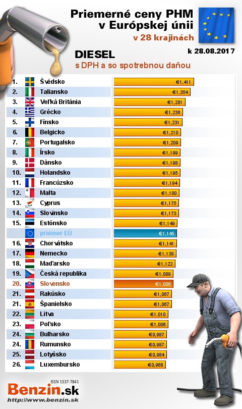 Na Slovensku čerpali motoristi 20. najdrahšiu motorovú naftu s daňou v rámci Európy: 1,086 EUR za 1L.