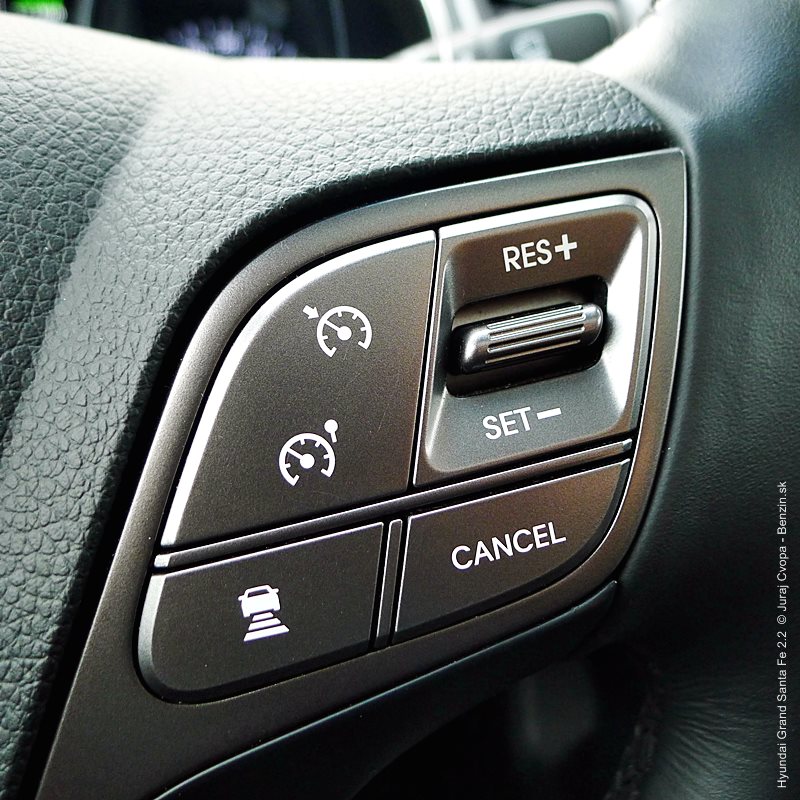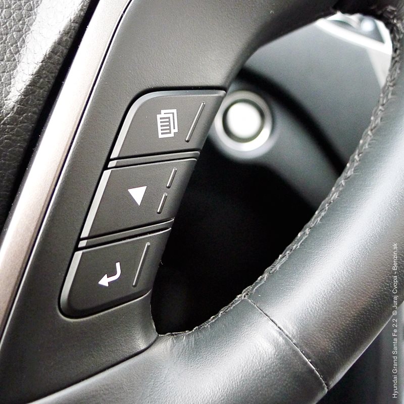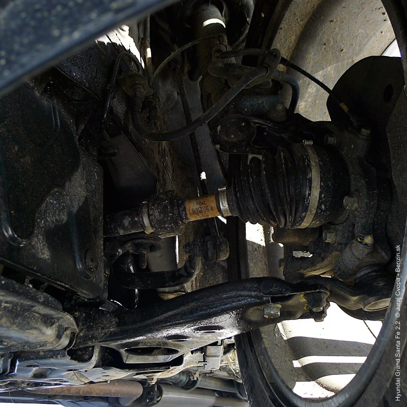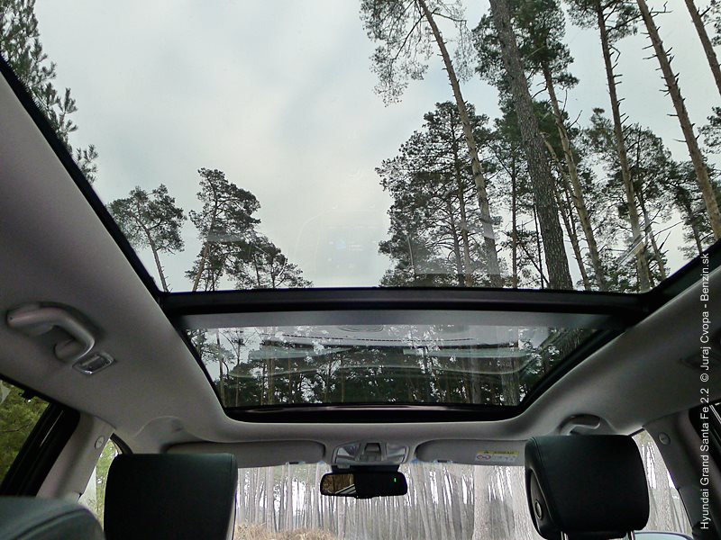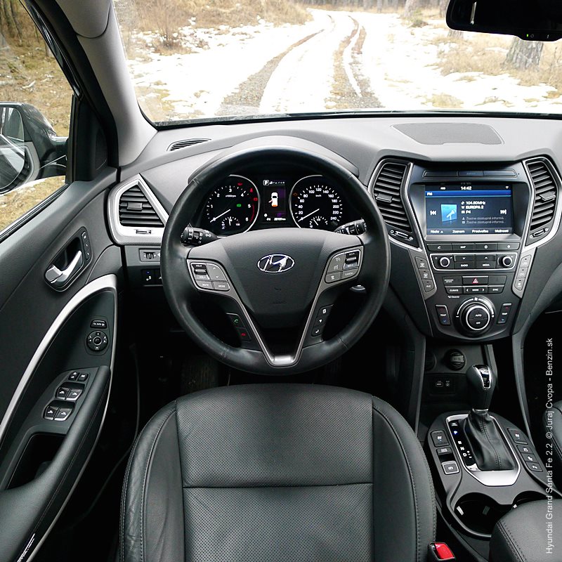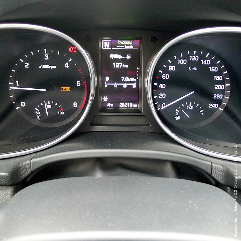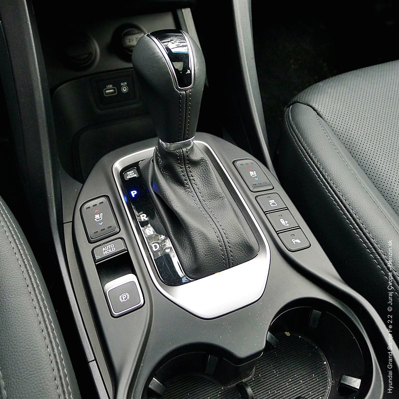 Pod kapotou pracuje 2.2-litrový preplňovaný štvorvalec, 147 kW (200 k), 440 Nm a 6-stupňová automatická prevodovka s možnosťou sekvenčného radenia. Motor svojimi paramterami k autu akurát pasuje, kameňom celého jazdného prejavu je však prevodovka. Veľký kolos v jej štandardnom móde predvádza pomalšie reakcie a letargickú odozvu na plyn. Pôsobí to ospalo a odradzuje od športových nálad. Pozorujem otáčkomer, plyn decentne stlačený, prevodovka radí vyššie pri 2000 min-1 a jazda prebieha okolo 1500 min-1. Stále. A pokiaľ sa ide do 90 km/h, štverá sa v podobných otáčkach aj na Pezinskú Babu, teda kopec, kde sa usporadúvajú závody do vrchu. No v móde Sport, to je ako prejsť na druhú stranu zrkadla. Z Grand Sana Fe sa tak stáva nabudené, k svetu sa majúce zviera, ktoré pomerne agresívne reaguje na najjemnejšie pohladenie plynu. A tu začína radosť.