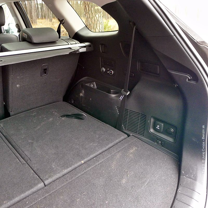 Čo sa batožinového priestoru týka, došlo na elektricky ovládané veko. Ovláda sa buď tlačidlom, príp. po 3 sekundách státia s kľúčom od auta pri veku sa toto otvorí automaticky. Slušné plus v prípade príchodu s bremenom k autu. Drobnosti sa dajú uložiť do malej dvojitej podlahy a zástrčka na 220 V poteší napr. pri núdzovom dobíjaní počítača alebo telefónu bez USB nabíjačky. Veko sa dá zatvoriť stlačením tlačidla.