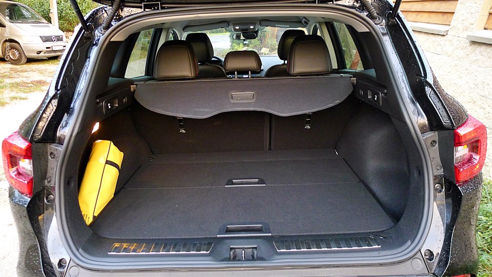![]() Posed na zadných sedadlách poskytuje dostatok priestoru, a to vo všetkých smeroch. Zarazila ma absencia vetracích výduchov pre zadných cestujúcich. Opakujem, že toto je najvyššia výbava (a Mégane to má – opakujem sa, ja viem). ![]() Batožinový priestor sa ľahko rozšíri automaticky sklápateľnými delenými operadlami (vznikne rovná podlaha), plus je tu možnosť sklopiť operadlo spolujazdca a takto previesť predmety dlhé do 2.5 m, alebo použiť toto operadlo ako stolík. Podlaha batožinového priestoru je delená, vyššia pozícia vytvára rovnú podlahu pri sklopených operadlách, po odstránení plata podlahy sa dá využiť väčší objem (472 litrov). Pod podlahu sa dá schovať horné rolo. ![]() Motor, prevodovka a jazda