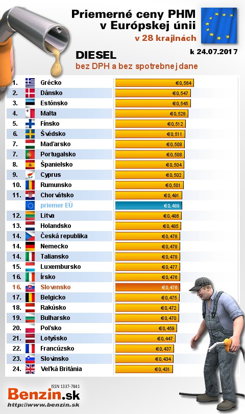 Nasledujúce údaje sú spracované podľa informácií EUROSTATU vydaných 27.07 k 24.07.2017 za obdobie v 29.týždni (od 17.07.2017 - 23.07.2017), ako ich uviedli členské štáty EU. Ceny sú uvádzané v euro. V tabuľke uvádzame štáty Európy podľa toho, za akú priemernú sumu v predchádzajúcich dňoch tankovali.