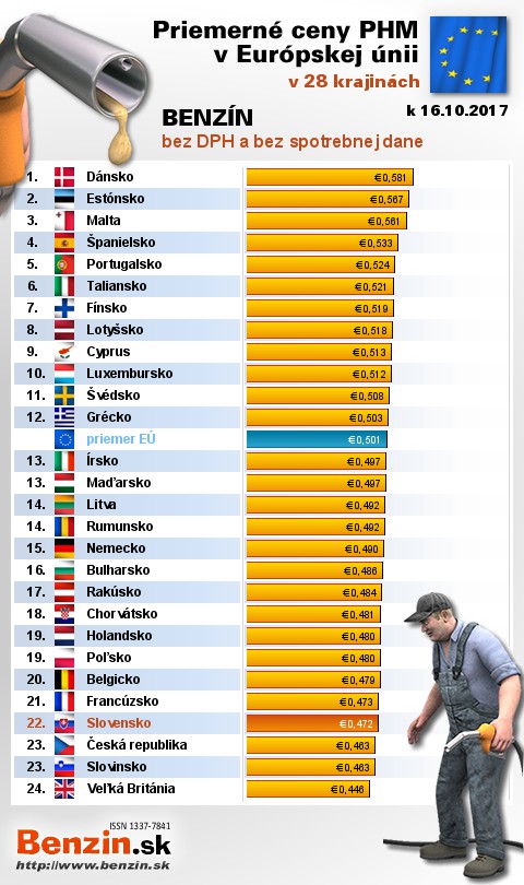 Na Slovensku sme tankovali 3. najlacnejší benzín bez dane v EÚ za priemernú cenu: 0,472 EUR za 1L.