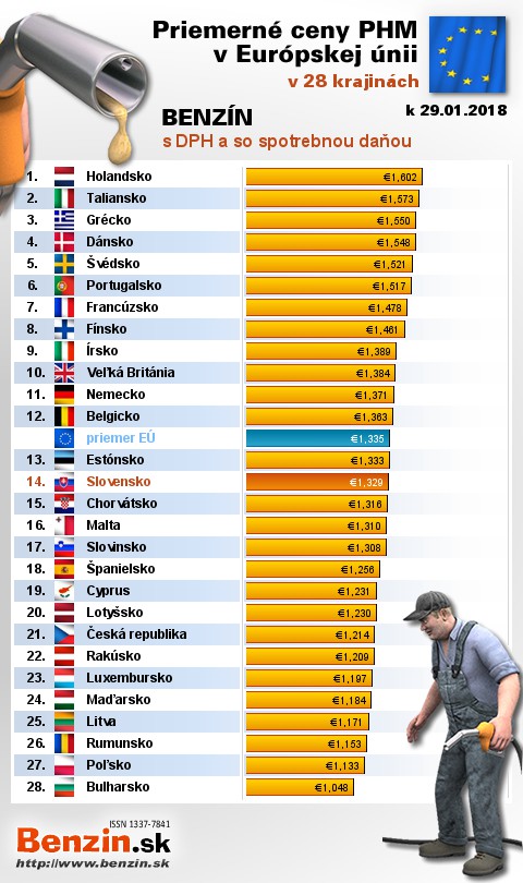 mali v Holandsku, kde motoristi v priemere zaplatili 1,602 EUR za 1L.
