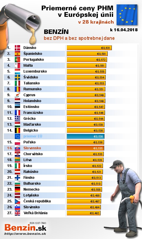 Na Slovensku sme tankovali 12. najlacnejší benzín bez dane v EÚ za priemernú cenu: 0,535 EUR za 1L.