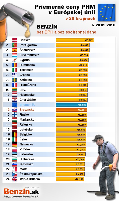 Na Slovensku sme tankovali 13. najlacnejší benzín bez dane v EÚ za priemernú cenu: 0,601 EUR za 1L.